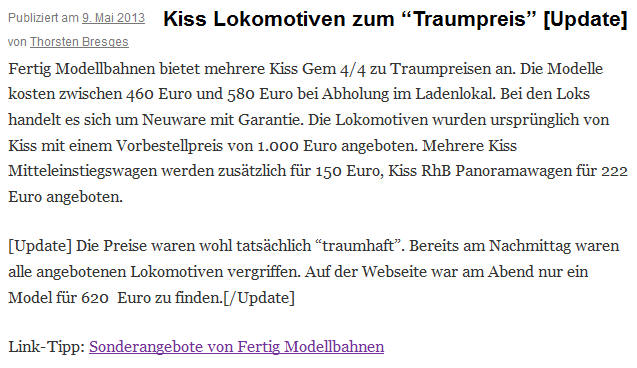 Das einzige, was mich an Fertig-Modellbahnen stört: immer Vorkasse. Mir wäre es lieber, die würden abbuchen, wie es andere auch machen.