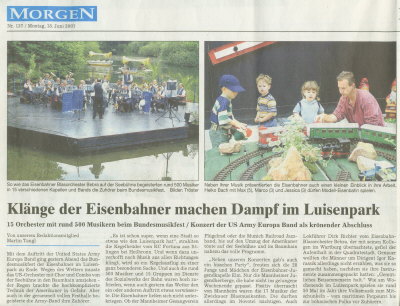Zeitungsbericht Mannheimer Morgen vom Montag 18.06.2001 über Bundesmusikfest der Eisenbahner im Luisenpark Mannheim