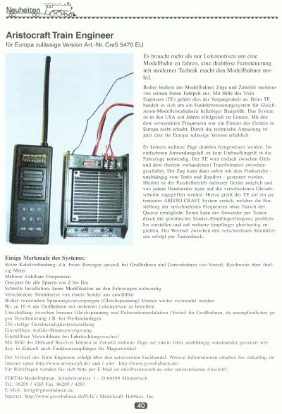 Bericht in der Gartenbahn 3 / 2001 über den von uns angebotenen und für Europa zullässigen TrainEngineer (inkl. deutscher Anleitung);